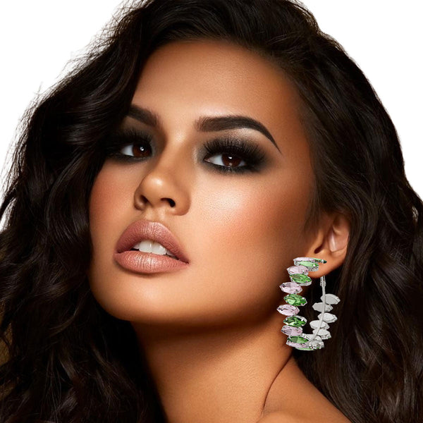 Experience the stunning beauty of Silver Metal with Light Pink and Green Marquise Glass Crystals Wide Hoop Earrings, measuring .85 inches wide. Add a touch of elegance and sparkle to any outfit with these exquisite earrings.