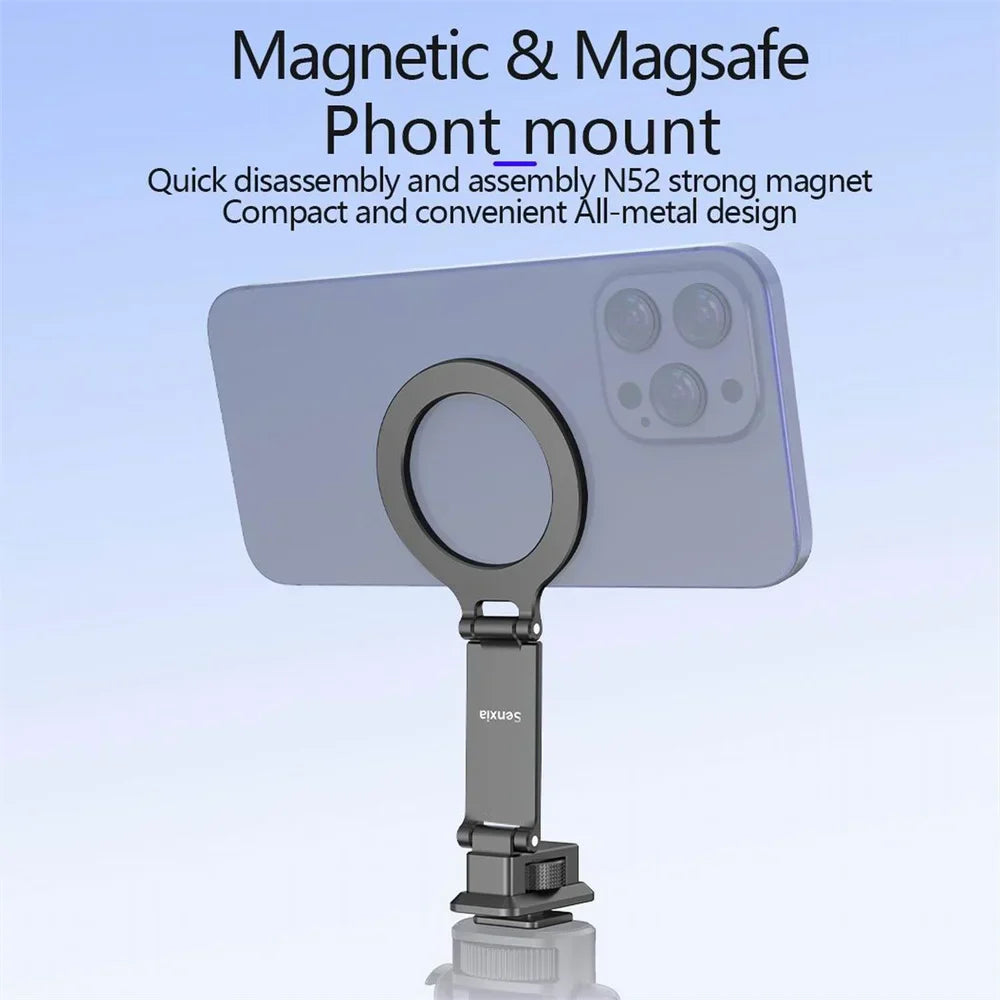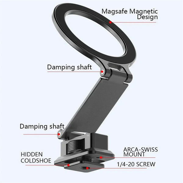 Experience seamless photography with this new metal magnetic phone tripod mount featuring a quick-release Arca cold shoe. Designed for MagSafe-compatible iPhones 15, 14, and 13, as well as Android devices, it offers secure attachment and effortless setup. Perfect for cameras and monitors, this versatile bracket enhances your shooting stability and convenience.